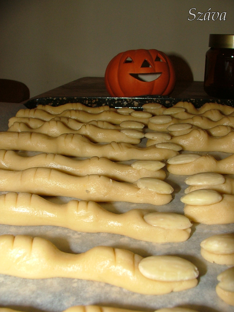 (Nagyon sok recept van az interneten, készülhetnek színes tésztából is zöld ujjak is vagy akár véres körmökkel! Utóbbihoz tojásfehérjehabból és porcukorból készíthetünk írókát, amit megszínezünk. Mindkettőhöz inkább zselé formájú ételszínezéket ajánlanék, egyszer kell megvenni és roppant sokáig elég, de nem hígítja a masszát.)