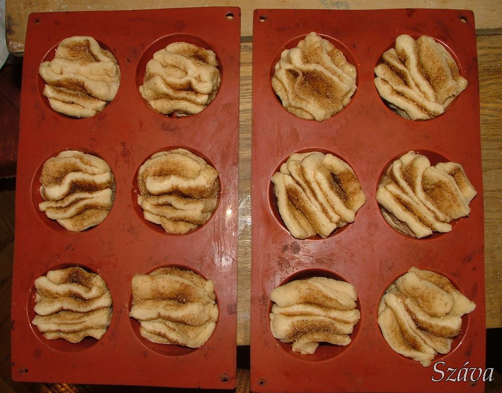Kinyújtjuk a megkelt tésztát (60*30 cm Citromhab utasítása szerint), hat hosszú csíkra vágjuk. Ötöt megkenünk olvasztott vajjal és megszórjuk bőségesen cukros fahéjjal. Egymásra helyezzük a csíkokat, úgy hogy az üres kerüljön felülre.