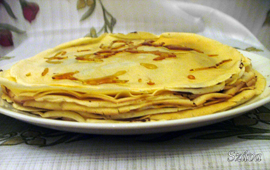 Étcsokoládéval összeragasztott, karamellával díszített tetejű palacsintatoronnyal ettük.