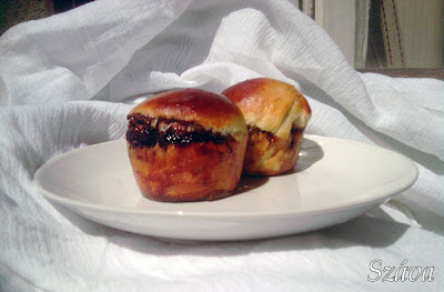 Az utolsó egyetemi napra kissé túlvállaltam magam, elaludtam, jegybeíratás, könyvtár, piac, jegyzetcsere és három egyetemi óra, fél órás szünetekkel, úgy, hogy ne nagyon késsek el sehonnan. Útközben a Vásárcsarnokban vettem magamnak egy csokoládéval bevont minikuglófot reggeli-ebéd-uzsonnának, de szegénykém már elég száraz volt… viszont olyan jól nézett ki a kerek puffancs, hogy úgy gondoltam kellene valami hasonlót sütni. A töltelék az teljes egészében lelépett belőle, kívülről borította be a kakaós-cukros máz… így sem volt rossz.. :)