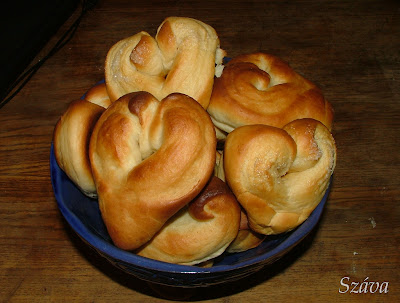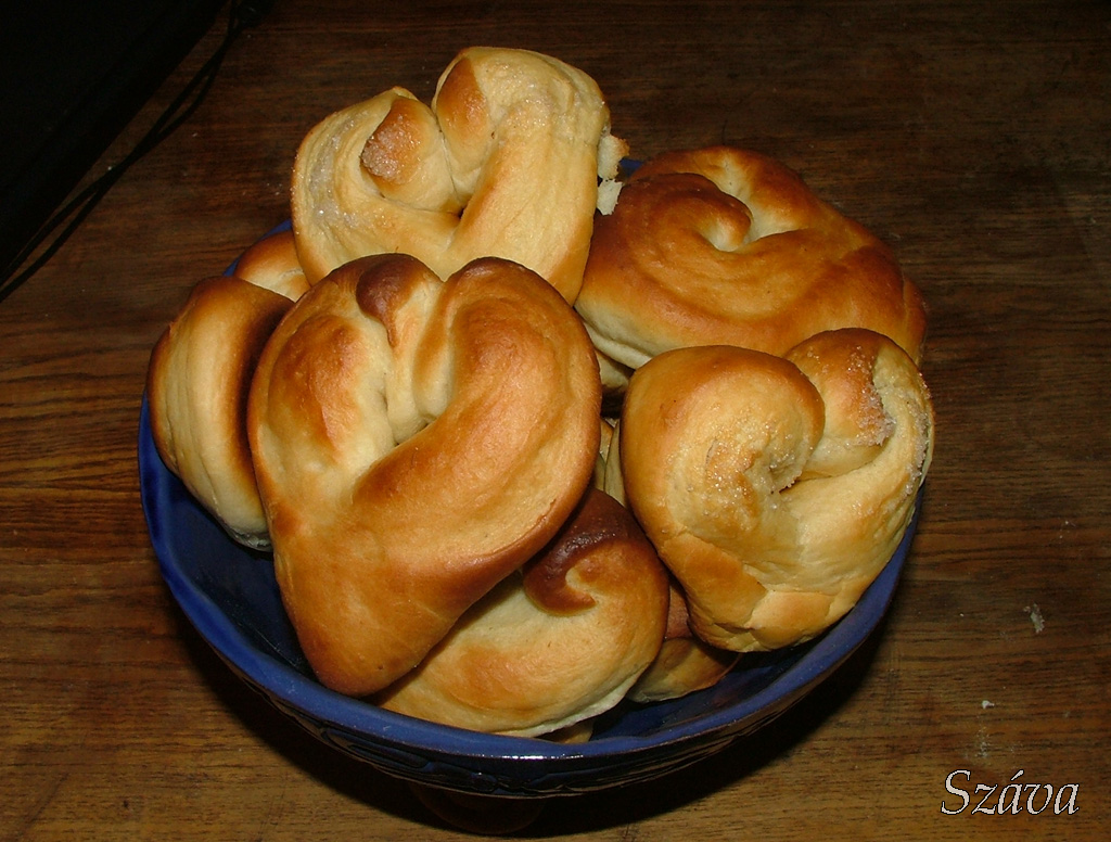 Egy óra múlva körülbelül a duplájára nő a tészta az edényben, ekkor lisztezett deszkára borítjuk és 10-12 részre vesszük szét. Ezeket egyesével gombóccá formázzuk és 10 percig hagyjuk pihenni. Majd oválisra nyújtjuk, feltekerjük, a tekercseket hosszában bevágjuk 2-3 centiméternyit hagyva csak egyben és visszafelé feltekerjük a füleket szívformára.