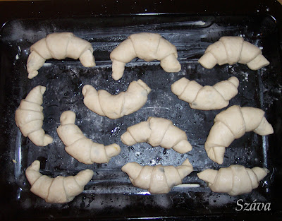 Félbevágtam keresztben, a két hosszú téglalapot pedig 6-6 háromszögre szeltem. A szélesebbik oldalától tekertem fel, a feléhez érve a keskeny végét még egyszer megnyújtottam a nyújtófával, így szebben feltekerhető az elvékonyodó csík.