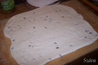 Kemény tésztagombócot dagasztott a gép a hozzávalókból. Az első dagasztás után kivettem egy húsz dekás adagot a másnapi kenyérhez, a maradékhoz hozzáadtam a tökmagot. Egy órát kelt, akkor kinyújtottam. Őszinte leszek: nem volt ötletem a formázáshoz, ezért elkezdtem hajtogatni, mint a pogácsatésztát. Jobbról az egyharmadát, balról az egyharmadát, fentről az egyharmadát, majd ráhajtottam a végét és kinyújtottam. Ezt kétszer és a hajtogatástól nagyon jó állaga lett. Addigra eszembe jutott, hogy lehetnének kiflik: kinyújtottam amilyen vékonyra és nagyra csak a deszka engedte.